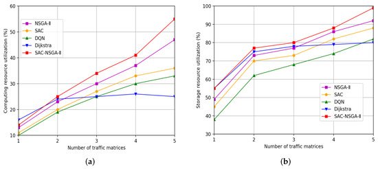 Turning to Figure 8b, the variation in storage resource utilization is depicted. Algorithm D exhibits the highest storage resource utilization when only one traffic matrix is considered. This can be attributed to its static allocation strategy, prioritizing storage availability over other factors. However, the DQN algorithm demonstrates the lowest utilization rate, significantly lower than that of Algorithm D. This indicates that the DQN algorithm struggles to allocate storage resources based on the changing traffic conditions effectively. Conversely, when the number of input traffic matrices exceeds one, SAC-NSGA-II leverages computing resources to achieve maximum storage resource utilization. This suggests that SAC-NSGA-II dynamically optimizes storage resource allocation to manage network congestion better and adapt to changing traffic patterns.