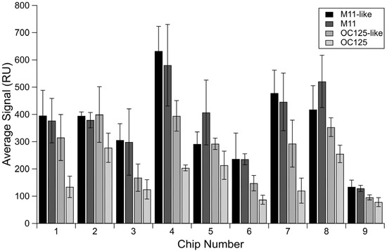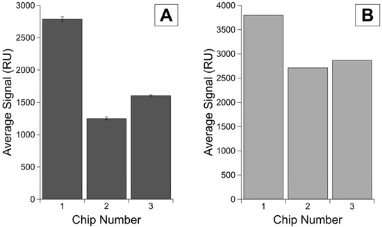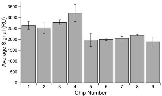 Average His-SA immobilization signal by chip. Averaged signal measured in Channel 1 for His-SA protein immobilized for blocking. Error bars are standard error of the mean, with n = 3.