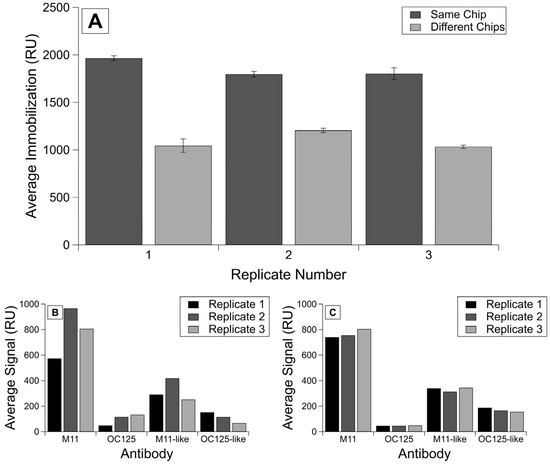 Comparison of immobilization and binding signals on the same chip versus different chips. Shown here is (A) the averaged corrected signal for each immobilization of R9 protein per replicate on the same chip or different chips. Error bars are standard error of the mean, with n = 4. Additionally, shown are averaged corrected signals for each antibody injection by replicates shown in (B) the analyte binding on different chips and (C) the analyte binding on the same chip.