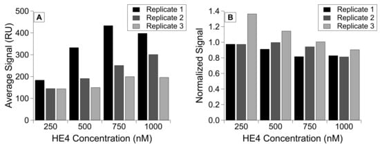 HE4 binding to monoclonal antibody, grouped by concentration of protein immobilized on the chip in three replicates. Comparison of (A) the corrected antibody binding signal and (B) the normalized binding signal for antibody injections, with corrected antibody signal divided by immobilization level.