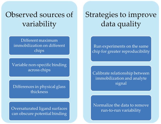 The present work demonstrates a variety of sources of possible variability when performing experiments using NTA chips, and we suggest corresponding controls that researchers can use to minimize the observed variation. By running experiments on the same chip, the effect of variable non-specific binding and different immobilization capacities can be minimized. It is also critical to calibrate the relationship between immobilization and binding signal of a given ligand–analyte pair, because calibration removes variability from possible different immobilization levels and allows for more consistent data when binding signal drops over time. Calibration also helps to ensure that tests accurately reflect any possible analyte binding and that potential binding has not been obscured by a ligand immobilization level that is too high or too low. Future work will assess more quantitative binding analysis methods, including studying how chip variability affects the fitting of kinetic parameters and increasing the number of replicates performed to make violin plots and to better understand sensor chip variability on a broad scale. In addition, there are insights to be gained about the physical properties of the chip by characterizing the surface morphology of the nanoparticles and quantitatively assessing how the thickness of the sensor chips affects data quality and reproducibility. Identifying sources of variability in NTA-based sensing experiments offers the opportunity to correct those sources of variation, improving reproducibility and yielding a more accurate measurement of ligand–analyte binding.