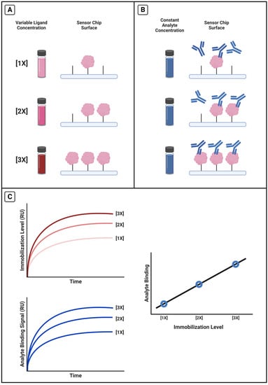 Calibration experimental method. (A) Selected range of ligand concentrations were immobilized onto the chip and achieved different immobilization levels before (B) the same concentration of analyte was injected and binding signal was measured. (C) Using TraceDrawer, the average immobilization signal and the average analyte binding signals were calculated and plotted against each other.
