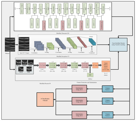 For OCT image classification, we propose a new deep learning method, which is represented in the main flow diagram in Figure 1. The methodology comprised several steps: data preprocessing, feature extraction employing pretrained models, feature optimization, and classification. This strategy implements advanced deep TL techniques with the objective of enhancing three pretrained models: ResNet-50, DenseNet-201, and InceptionV3 [34]. Upon extraction of the features from these modified models, the resulting vectors were refined using an advanced algorithm known as ACO. Finally, the refined features were subjected to multiclass classification to obtain the final results (Table 1).