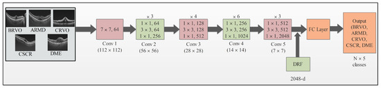 The ResNet architecture has been demonstrated to have superior performance by creating a more direct path for information flow throughout the network. This architecture also addresses the issue of the disappearing gradient in backpropagation. The utilization of shortcut connections, known as residual networks, allows the bypassing of layers, which may not be beneficial during training. The architecture of ResNet-50 includes a 7 × 7 convolution layer with 64 kernels, a stride 2, 3 × 3 max-pooling layer, a 7 × 7 avg-pooling layer with stride 7, 16 residual building blocks, and a final FC layer [37]. The ResNet-50 model has 23 million trainable parameters. In this study, we modified the pretrained ResNet-50 model by eliminating the final FC layer that initially supported 1000 object classes. Our focus was on an OCT image dataset comprising only five classes, and we incorporated a new FC layer with five layers. Subsequently, we applied deep TL techniques to train the modified model. Our transfer learning approach enabled us to generate a modified model suitable for feature extraction. This modified model was utilized to extract features from the global average pool layer, which resulted in feature vectors with dimensions of N × 2048. The architecture of the modified model is shown in Figure 2.