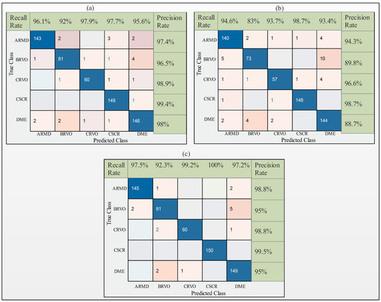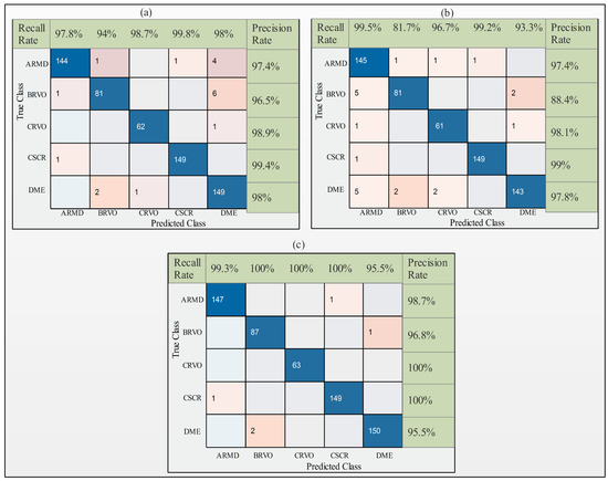 Next, OCT images were utilized for the experimental process. The modified deep learning models ResNet-50, InceptionV3, and DenseNet-201 were employed to generate the results. The performance of the ResNet-50 model is summarized in Table 5. The results indicate that cubic support vector machine (CSVM) performed better than the other proposed ML classifiers. The highest accuracy obtained using ResNet-50 was 98% using cubic SVM. The precision rate, recall rate, and AUC were 98%, 97.6%, and 1, respectively. Quadratic SVM achieved the second best accuracy of 97.1%, with a precision rate, recall rate, and AUC of 98%, 97.6%, and 1, respectively. Linear SVM, cosine k-nearest neighbor (KNN), weighted KNN, subspace discriminant, and subspace KNN achieved accuracies of 95.4%, 94.3%, 92.4%, 75.1%, and 95.9%, respectively. The difference in accuracy between the quadratic and cubic SVM was approximately 0.4%. The confusion matrix for the ResNet-50 model and ACO is shown in Figure 6a.