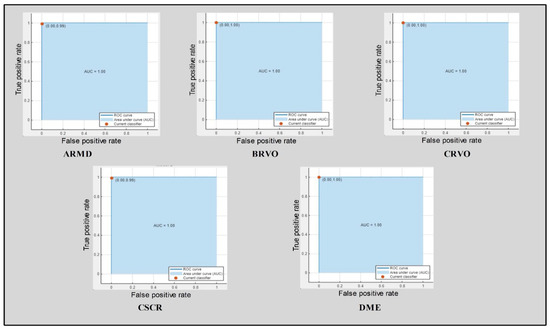 The results are summarized in Table 7. The best accuracy was achieved using the modified DenseNet-201 model and ACO. The best accuracy obtained by CSVM was 99.1% using the optimized features. The precision, recall, and AUC were 98.9%, 98.2%, and 1, respectively. The computational time noted was 47.1 s. The second best accuracy achieved by QSVM was 95.9%, with a precision rate, recall rate, computational time, and AUC of 98.5%, 97.7%, 66.3 s, and 1, respectively. The third best accuracy was 98.3%, achieved by the subspace discriminant with a precision rate, recall rate, computational time, and AUC of 98.22%, 98.06%, 60.2 s, and 1, respectively (Table 5, Table 6 and Table 7). The computational time was also considered for each classifier, and the optimal time was 50.4 s for CSVM. The confusion matrix for the DenseNet-201 model and ACO is shown in Figure 6c. The receiver operating characteristic curve (ROC) plots for the selected OCT image classes of the modified DenseNet-201 model using cubic SVM after applying ACO are shown in Figure 7. A sample of the OCT image dataset with the corresponding color images used to understand the input dataset images is shown in Figure 8.