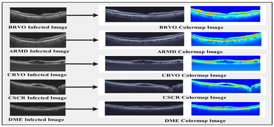 The human retina is essential for processing visual information. The inner surface of the eyeball is lined with a layer of photosensitive optical nerve tissues [1]. The retina receives the light focused by the lens, which produces neural signals. Inside the retina, the macula, responsible for sharp and sensitive vision, perceives visual details, colors, and light intensities. With the aid of the optical nervous system, the retina analyzes these data before transmitting neural impulses to the brain. Eye conditions, such as macular degeneration, which are often ignored, can cause total vision loss [2,3]. Ophthalmologists typically categorize these diseases into five classes. Age-related macular degeneration (ARMD), branch retinal vein occlusion (BRVO), central retinal vein occlusion (CRVO), central serous chorioretinopathy (CSCR), and diabetic macular edema (DME) are conditions that can lead to blindness [4]. These diseases affect the retina, the light-sensitive layer at the back of the eye, and can result in vision loss if left untreated [5].