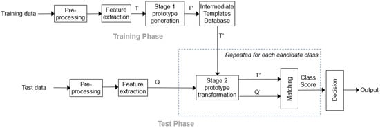 The Instance-based Adaptive Template Reconstruction (I-ATR) algorithm consists of two phases (cf. Figure 1). Phase 1 (Training Phase) generates intermediate templates by reconstructing the initial templates, so that the between-class separation is enhanced. Phase 2 (Matching Phase) further transforms these intermediate templates based on the query patterns to establish the best class assignment for the given query. Where multiple instances are available for a given query, they can also be transformed. Phase 2 transformations are carried out class-wise so that the distance between the query and the nearest template within that class is the smallest. The following sections describe the proposed algorithm in more detail.