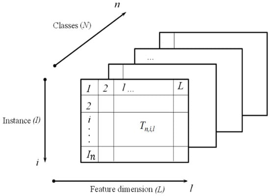 Consider an N-class classification problem. T denotes the instances of the training set, the query (test) instances are denoted as , and the instances per class as , where n indicates the class label (1 ≤ n ≤ N). Each instance is an L-dimensional feature vector, while each class may have a different number of instances. A three-dimensional matrix , could be used to represent the data elements of the feature vector in the training set. Here, denotes the index of an instance with a specific location, n denotes the class to which that instance belongs, and l denotes the feature dimension index (1 ≤ l ≤ L) (c.f. Figure 2). , (1 ≤ r ≤ R), represents the query descriptor where R is the number of feature instances available per query event. In a typical pattern classification task, R = 1; however, for time-series data (such as EEG recordings), multiple feature vectors can easily be generated from the same recording, thus resulting in multiple feature vectors from one recording (R > 1).