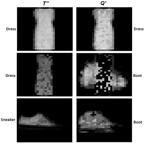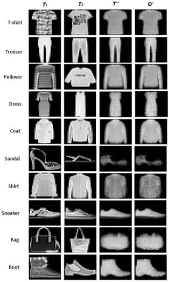 We also conducted a series of experiments to explore its effectiveness while the system was present with an image from a different class. A few visual comparisons using images from different categories are illustrated in Figure 4. In particular, the Boot category is purposely used as the query against some different training categories for this illustration, as it has been noticed that the Boot is the class that usually caused most of the erroneous classifications; it also tends to be confused with the Sneaker category. In Figure 4, we also highlight the impact toward the reconstructed training templates while images from the same class and a different class are presented separately for testing. For example, while feeding the Boot sample query to the Sneaker training category, the resulting reconstructed training template is much less like the genuine case (cf. Figure 4 Sneaker T″ and Boot Q′ for this comparison). It has been found that the proposed method was able to maintain low false positive rates (<1%) for the FASHION-MNIST dataset by reconstructing the training templates.