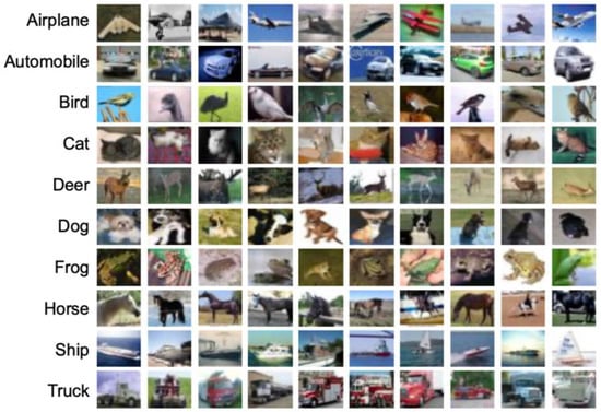 Figure 5 presents 10 random images from each class of this dataset. The classes are mutually exclusive. There is no overlap between automobiles and trucks. “Automobile” includes sedans, SUVs, etc., and “Truck” includes only big trucks. Neither includes pickup trucks [].