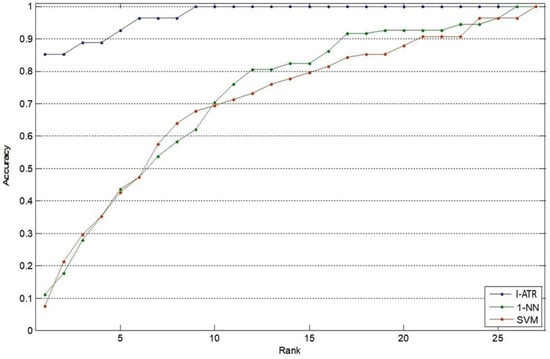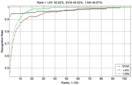 The CMC results of the I-ATR algorithm are shown in Figure 10 for the identification scenario. The recognition results obtained using the conventional classifiers are also included for comparison.