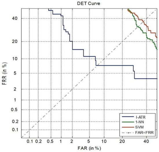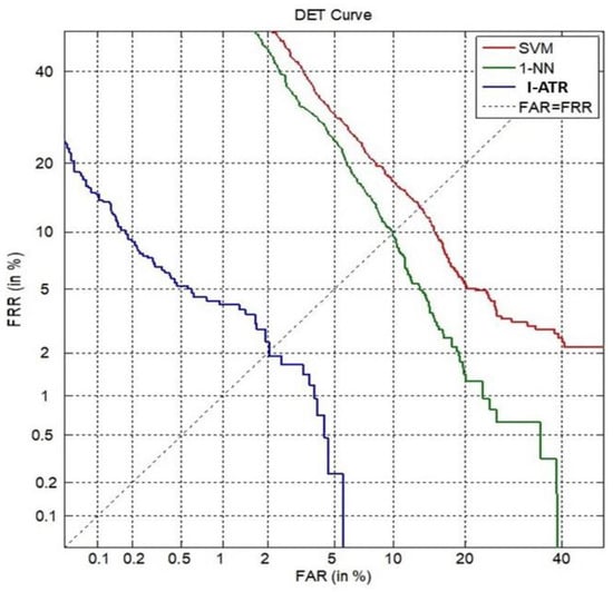 The DET curves for the Mobile Sensor Dataset are presented in Figure 11. Due to the challenging experimental setup (limited and noisy EEG data from a low-cost single dry sensor, cross-session test data), the EER values of all the illustrated algorithms were found to be not as low as those with the MM/I dataset (cf. Figure 9). However, it is clear that the I-ATR still produced much superior EER compared to the other two conventional classifiers. The EER of I-ATR method is around 7.5%, whereas both the 1-NN and SVM schemes’ EER values are higher than 30%.