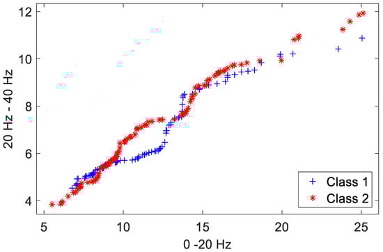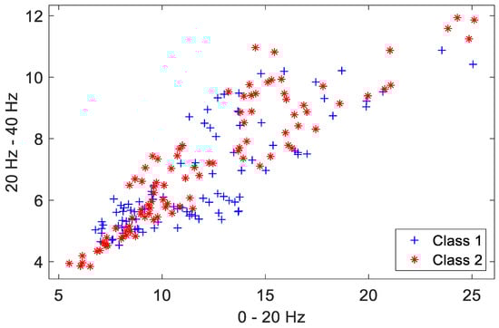 A two-class person recognition problem is constructed using data from two randomly selected subjects (hereinafter referred to as Class 1, Class 2) of the MSD for this experimental analysis. The initial pattern distribution of the first two dimensions in the feature space (12 dimensions in total for each feature vector, ) for the two classes is shown in Figure 12. The distribution of the extracted features from the instances in the training set is depicted, with each class containing 95 feature instances. The two dimensions shown in the figure along the axes correspond to their approximate frequency ranges in the wavelet domain. Clearly, these initial features are quite intertwined in the pattern space.