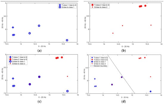 Illustration of the Phase 2 process of the I-ATR algorithm using only the first 2-dimensions of the feature vector for a 2-class problem, where the query Q is from Class 1. (a) T and Q are biased for Class 1. (b) T and Q are biased for Class 2. (c) The training-query features for the two-class scenario merged together. (d) The classification outcome.