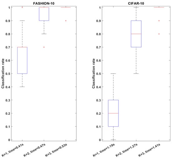 Comparative analysis of FASHION-MNIST and CIFAR-10 datasets using boxplots; each column was generated using 100 tests. The impacts of parameter K and recognition time on classification rate are illustrated.