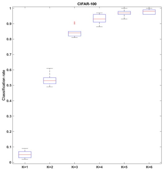 The impact of parameter K on classification rate for CIFAR-100 with 100 image classes. Each boxplot was generated from 100 tests.