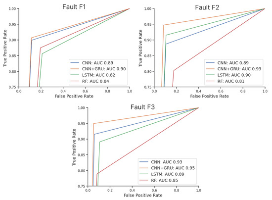 Next, Table 5 presents summarized metrics for each fault model, including accuracy, precision, recall, score, and area under the curve (AUC). For models, the CNN+GRU model attained the highest accuracy of and an score of , indicating a favorable balance between precision and recall. The RF model yielded satisfactory results with an accuracy of and an score of , outperforming the LSTM model which exhibited comparatively lower performance. This outcome can be attributed to data scarcity, as the models from DL usually cope better with larger datasets and therefore provide more accurate results in such a context.