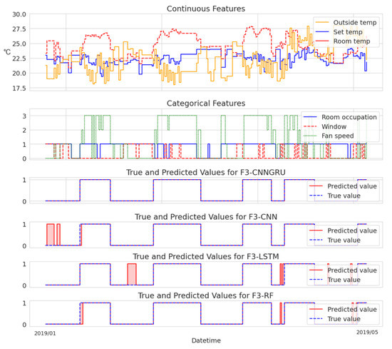It is crucial to emphasize that any gaps in the data resulting from the data preprocessing stage were disregarded for the purpose of visualization. The selected continuous features included outside temperature, set temperature, and room temperature, while the categorical features encompassed room occupation, window status, and fan speed.