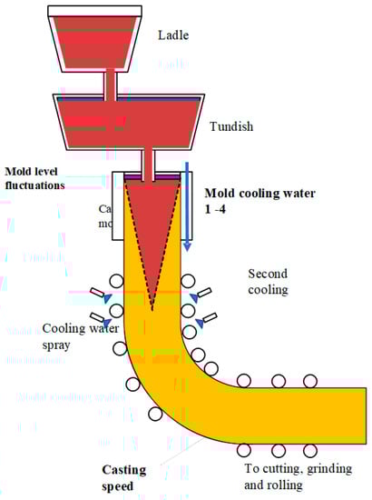 Monitoring the final properties of steel manufactured products is an indispensable procedure to guarantee their final quality. As one of the key processes in steel production in the modern industry, continuous casting has become a research focus of steel production companies, design, engineering, and research institutes. In the continuous-casting process, liquid (molten) steel is poured from a ladle into the tundish, then flows through submerged entry nozzles into one or several water-cooled copper molds []. The copper mold serves as the primary cooling unit, where a solidified shell forms around the molten steel. The cooling process of metal (or casting strand) is finished by several water-spray cooling zones, referred to as secondary cooling []. At the end of the casting line, the strand is cut off and transferred for inspection, then into rolling and finishing sequences. The schematic diagram of a continuous-casting machine is presented in Figure 1.