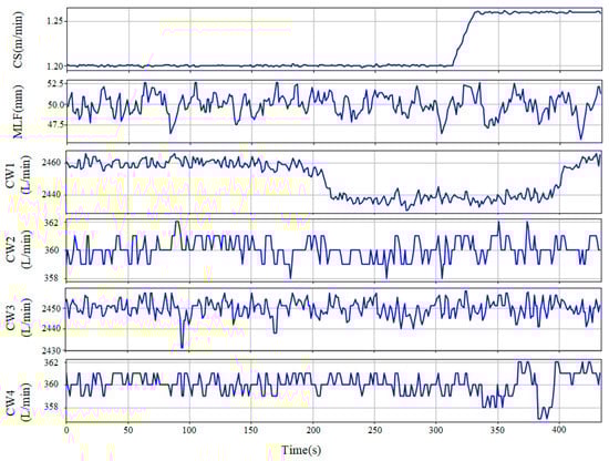 The sensor dataset was from a continuous-casting mold in one slab continuous-casting machine at a local steel industry. In the casting process, a variety of parameters were monitored and controlled via industrial sensor networks, including the fluctuations of the mold top surface, the flow rate of argon gas and molten steel in the SEN port, the oscillation amplitude of the casting mold, the temperature in the tundish, and the flow rates of cooling water from the sides of casting mold. To reduce the transmission cost, all sensor signals were down-sampled to 1 Hz and uploaded to the cloud server, where necessary data would be downloaded for further detailed analysis. In this case study, 6 process parameters, which were considered as key variables by experts on-site, were analyzed, including cast speed (CS, m/min), mold-level fluctuation (MLF, mm), and flow rates of mold cooling water from the four sides of the casting mold (CW 1–4, L/min). Records relevant to the lock-down of rolling production lines caused by slag inclusions were also obtained as quality references, which would be processed into binary labels (“normal”-“defective”) of production quality. According to the production lists and quality labels, approximately 7300 slabs, including 327 defective (“positive”) samples, were investigated. Different condition parameters of 4 representative samples in the dataset were displayed in Table 1.