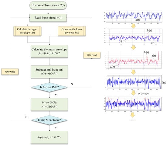 The general flowchart of EMD. A brief example of the calculation of “IMF” and “Residual” in each iteration has been placed on the right side of the figure.