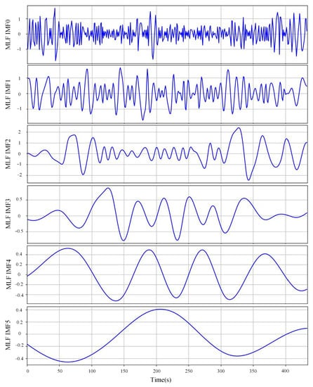 Different from signal-processing techniques, EMD doesn’t rely heavily on the selection of hyperparameters (such as the selection of wavelet functions for wavelet decomposition), thus it is self-adaptive and flexible for time-series data. In this research, a Python integration of EMD was realized, with the maximum number of IMFs set to 8. The result of the EMD decomposition of the MLF signal from one cast sample is presented in Figure 4.