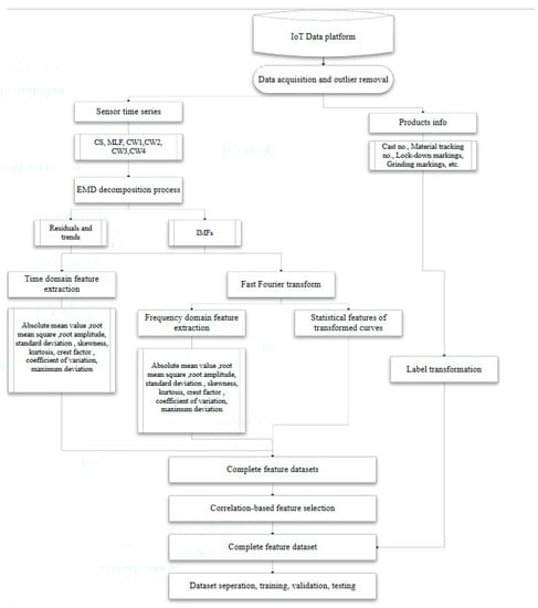 Feature-engineering procedures were executed using Python toolboxes including SciPy and Tsfresh after the data preprocessing. Nine classical condition parameters were obtained by statistical analysis from all the IMF, trends, and residuals on the time domain, including absolute mean value (T0), root mean square (RMS, marked as T1), root amplitude (T2), standard deviation (T3), skewness (T4), kurtosis (T5), crest factor (T6), coefficient of variation (T7), and maximum deviation (T8). Fast Fourier transform (FFT) was applied for each IMF. From the frequency band, central frequency (F0), mean square for frequency (F1), root mean square for frequency (F2), variance for frequency (F3), and signal energy in the frequency domain (F4) were extracted. Another set of important parameters was acquired from the phase spectrums of the transformed IMF signals, including the absolute mean value (F5), RMS (F6), root amplitude (F7), standard deviation (F8), skewness (F9), kurtosis value (F10), crest factor (F11), and maximum deviation (F12). A total of 446 features from 24 IMFs, 12 trend signals, and 12 residuals were included in the feature dataset. The process of data acquisition, signal processing, and feature extraction is presented in Figure 6.