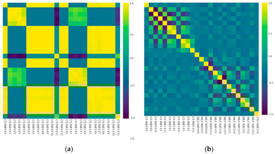For most of the ML algorithms, multicollinearity could reduce the performance of a model, leading to a higher standard error and higher model complexity as well as making the research on feature importance harder []. For this reason, a Pearson-correlation-based filtering method was conducted in the feature-selection process. If the Pearson correlation coefficient between two features was above 0.85, one of the variables was removed. In the feature-selection process, only 126 out of 446 features were preserved. Most of the features eliminated were the descriptions of detailed modes in CW1-CW4, which were highly corresponded from engineering aspects. Pearson correlation-based heatmaps before and after feature selection are presented in Figure 7, showing the effects of removing highly correlated features. The researchers used 60% of the labeled data for model training and 20% for parameter optimization; 20% was preserved for the testing of the tuned model.