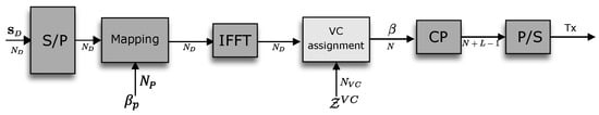 Figure 1 shows the proposed modification of the conventional OFDM transmitter by incorporating a block for allocating the zero vector for the use of VC. It is assumed that the active carriers are placed on the subcarrier index belonging to the set , and the elements of can be expressed as
