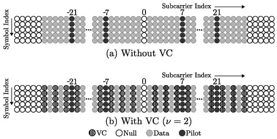 Due to the inclusion of VC, there are only active carriers, where and . Figure 2 illustrates an example of the 802.11 p frame with virtual carriers for the case of .