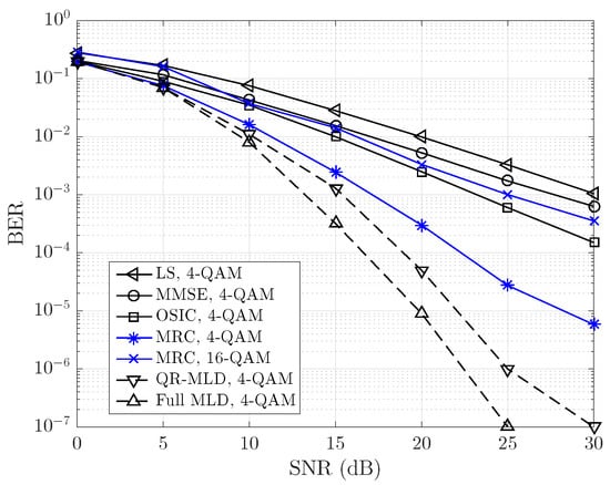 The MRC detection of the proposed system demonstrates near performance to nonlinear detectors, such as QR-MLD and MLD, at low SNR levels. However, beyond 15 dB of SNR, the nonlinear detectors exhibit a notable advantage. It is important to consider that there is a significant disparity in the number of operations required for nonlinear detection compared to MRC detection. While MRC detection has linear complexity, nonlinear detection exhibits exponential complexity relative to the size of N.