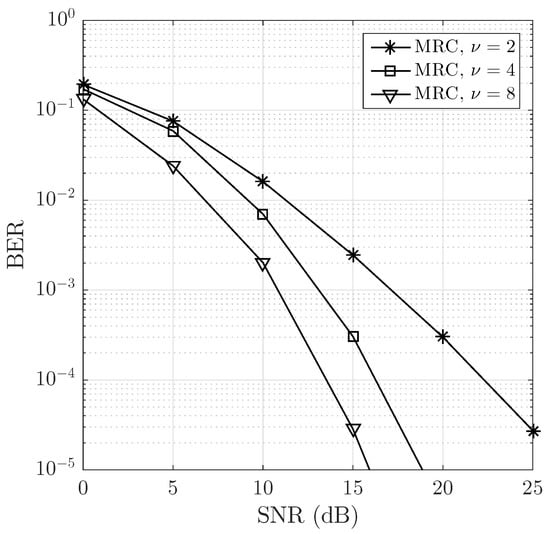 In order to observe the degree of impact on the system performance when increasing the diversity in the data during MRC detection, the parameter was modified to and 8. Figure 5 illustrates a BER vs SNR comparison of the proposed system for two different values of . For the specific case of SNR = 15 dB, the proposed system configured with and outperformed the system configured with by 5 dB and 10 dB, respectively. Increasing factor leads to a significant improvement in the system’s performance. This is due to the increased diversity at the receiver. With a factor of , the proposed system behaves like an equivalent single-input multiple-output (SIMO) system of , receiving four replicas of the transmitted data vector. Similarly, with , it behaves like an SIMO system, receiving eight replicas of the transmitted data vector.