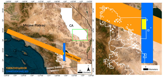 Index map. Anza-Borrego Desert State Park (white outline; both panels) spans regional geologic, topographic, and ecological gradients in California, USA. This study uses one AVIRIS flight line (orange) and one WorldView-3 image (blue). The analysis focused on the triple intersection (yellow rectangle; both panels) of the park boundary with AVIRIS flight line (orange) and WorldView-3 image (blue). True color basemap. The inset map shows the entire state of California; the green box overlay shows the extent of the left panel; and the gray box overlay shows the extent of the right panel.