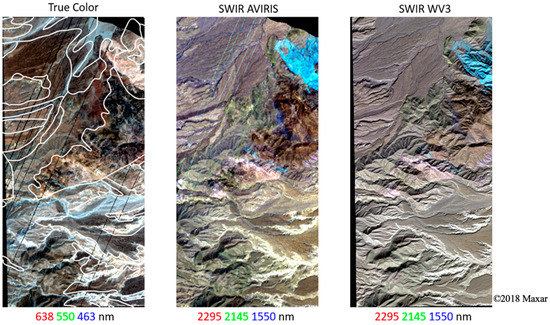 Study area (extent of yellow box in Figure 1). True color AVIRIS image (left) with geologic unit boundary vectors overlaid (white; [25]), compared to SWIR false color composites of AVIRIS (center) and WorldView-3 (right). Compared to the true color imagery, geologic information is more apparent in the SWIR composites, particularly the carbonate absorptions in the marble unit (cyan; NE corner of all images). Note that AVIRIS is spatially coarser than WV3 (15 m versus 4 m) but spectrally finer (10 nm imaging spectroscopy vs. broadband multispectral). Linear 2% stretch applied to each image.