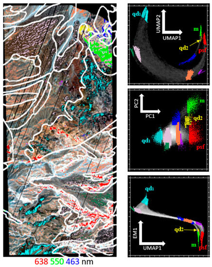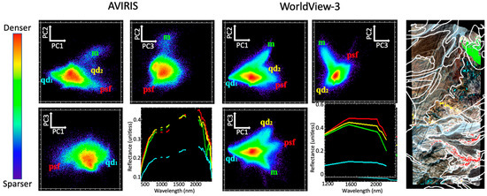 Linear (PCA-based) characterization of the spectral feature spaces of reflectance (Figure 3) demonstrates similar topology and endmember spectra for the AVIRIS and WV3 datasets. Furthermore, the finer spatial resolution of WV3 allows for an additional (qd2) endmember to be discerned which is present but not clearly identifiable in the low-order feature space of the AVIRIS imagery. For both sensors, the endmembers correlate to known geologic features.