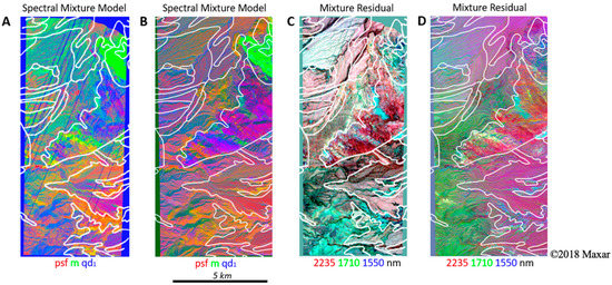 The psf, m, and qd1 EMs were then used to perform spectral mixture analysis [29,30,31], with wavelength-explicit retention of the mixture model residual [20]. Endmember fraction images from the AVIRIS and WV3 mixture models (Figure 4A and B, respectively) effectively map areas dominated by each EM lithology. False color composites of AVIRIS and WV3 mixture residuals (Figure 4C and D, respectively) highlight areas with higher wavelength-specific misfit of the model, highlighting differences in the curvature of spectral continuum and narrowband absorption features which correspond to additional mineralogical diversity which is not well fit by the simple 3-EM mixture model.