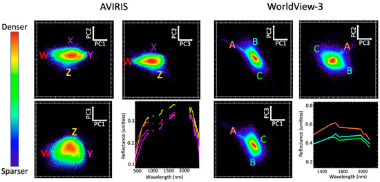 Mixture residual spectral feature space. Regions associated with different geologic features are identifiable for both sensors, but substantially more spectral information can be obtained from AVIRIS than WV3. Specifically, AVIRIS captures differences in VNIR curvature and amplitude, and narrow SWIR absorptions, which are not resolved by WV3. The reflectance spectra for endmembers identified from the MR feature space (lower right for each sensor) correspond to W, X, Y, and Z in the AVIRIS image and A, B, and C in the WorldView-3 image.