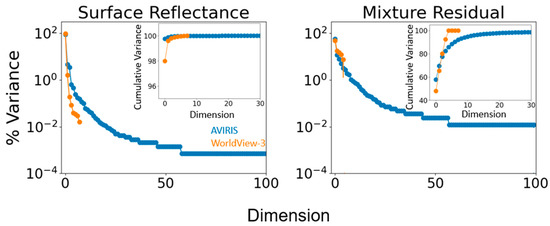Partition of variance. Normalized eigenvalue distributions are shown for surface reflectance (left) versus mixture residual (right), as well as for AVIRIS (blue) and WorldView-3 (orange). Inset shows the cumulative variance. AVIRIS reflectance shows greater spectral dimensionality than WorldView-3, with 99% of image variance requiring 7 dimensions for AVIRIS versus only 2 dimensions for WV3. Between-sensor differences in dimensionality are further pronounced in the mixture residual, with AVIRIS capturing 90% variance in 7 bands and 99% variance in 39 bands, but with WorldView-3 capturing 90% variance in 4 bands and 99% variance in 5 bands. WorldView-3 residual eigenvalues are numerically indistinct from zero after the 5th dimension.