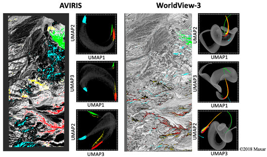 Nonlinear dimensionality reduction was performed for both the AVIRIS and WV3 reflectance and residual images using Uniform Manifold Approximation and Projection (UMAP) [32]. The number of nearest neighbors used was 50, and the embedding dimension was 3. For both AVIRIS and WV3 data, UMAP demonstrates enhanced clustering relative to variance-based characterization (Figure 7; compare to Figure 5).