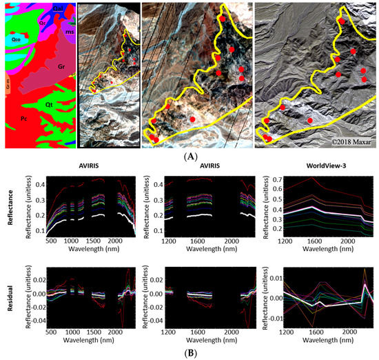 Intra-unit heterogeneity. (A) Geologic map units overlaid on the study area (left). Granite (Gr) unit highlighted in yellow on the AVIRIS true color image (center left). The enlarged view of the Gr unit on AVIRIS (center right) and WorldView-3 (right) highlights differences in spatial resolution. Single-pixel spectra are marked by red circles. (B) The average spectrum of the Gr unit (white line) is compared to the 12 single-pixel spectra selected within the unit for the reflectance (top row) and residual (bottom row) of both AVIRIS and WorldView-3. The left column row displays the full spectral extent of AVIRIS, while the middle column trims the AVIRIS spectra to the extent of the WorldView-3 column on the right. Differences between the single-pixel reflectance spectra and the Gr unit average spectrum are more clearly identifiable in the residual spectra than in the reflectance spectra and in the AVIRIS spectra than in the WorldView-3 spectra. All reflectance images are shown in true color.
