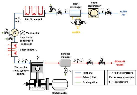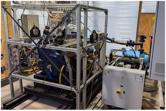 The engine is driven at 500 rpm (min) by means of an asynchronous motor, which allows maintaining the constant reference speed. The temperature of the lube oil and the coolant of the engine is controlled by an external independent lubrication-cooling system. Both temperatures are established at 333 K to ensure good lubricity conditions. The intake air temperature is conditioned to 323 K by five resistors found in the inlet line, while the intake air pressure is set at 1.3 bar (0.13 MPa) with the help of a root compressor. These conditions were selected as representative of an engine working with a low compression ratio but with the possibility to produce fuel autoignition not only with fossil diesel fuel but also with sustainable aviation fuels with a high cetane number. Effectively, the installation has the possibility to work under other atmospheric conditions.