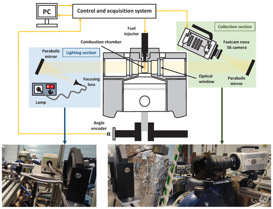 Scheme of the used Schlieren system and views of the mounting on the engine.