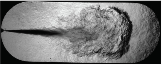 Figure 4 illustrates an image of a fuel spray taken with the Schlieren technique. The different intensities of light observed are due to the deviation suffered by the light beam from its original direction of propagation. The smallest gradients are away from the tip of the nozzle and within the vapor phase, while the greatest gradients are within the liquid phase of the fuel and near the nozzle. This is because the light beam interacts with the injected fuel spray and with the air–fuel blend, modifying the refractive index and, consequently, the light deflection.