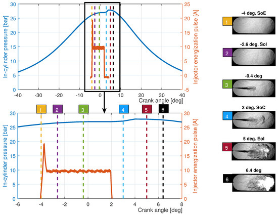 For illustrative purpose, Figure 5 shows an example of a fuel injection process (in this case, fossil ultralow sulfur diesel fuel without biodiesel fuel) with the images taken in the experimental tests of this work. The in-cylinder pressure signal and the injector energization are represented together with Schlieren images of the main events: the start of energization (SoE), the start of injection (SoI), the start of combustion (SoC) and end of injection (EoI).