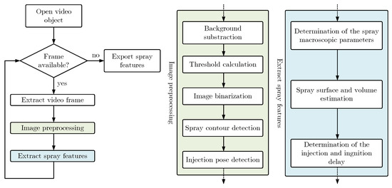 The first step is to remove the image background to work only with the pixels of the image, which belongs to the spray [33]. Afterward, the resulting grayscale image is converted to a black and white image by means of a binarization procedure [34], which previously required threshold determination [35]. The black and white image can be now treated to detect the spray contour [36] and the injection pose. Finally, the macroscopic parameters of the spray can be determined together with the injection and ignition delay. Figure 6 represents the described flowchart of the image-processing algorithm.