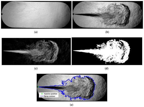 Example of the image preprocessing sequence. (a) Background mean image. (b) Fuel spray. (c) Subtracting the fuel spray image from the background image. (d) Binary image. (e) Spray contour and position of the injector.