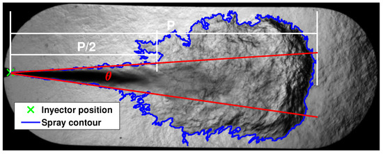 The fuel spray cone angle is calculated as the angle between the straight lines obtained by fitting to a linear polynomial the points on the sides of the spray contour from the closest point to the injector to 50 % fuel spray penetration [41,42]. Figure 8 shows the macroscopic parameters calculated on an Schlieren image.