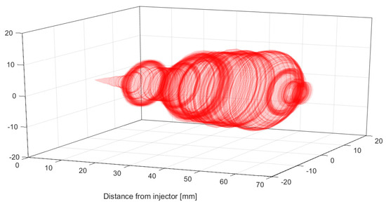 The spray surface and volume are also obtained from the spray contour. These two parameters are obtained by calculating a symmetrical spray contour that allows its rotation about the spray central axis. For this purpose, the Matlab function regionprops is used to determine the values of the spray centroid and orientation, and thus be able to calculate the spray central axis [39]. Using the obtained central axis, the spray contour is divided into an upper contour and a lower contour. Therefore, there are two distinct distances from the central axis to the spray contour along the x-axis of the image. To obtain a symmetrical contour, the distance must be the same. So, an average of these two distances is taken to determine an equivalent distance by means of