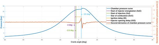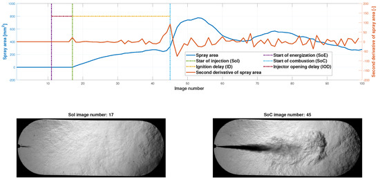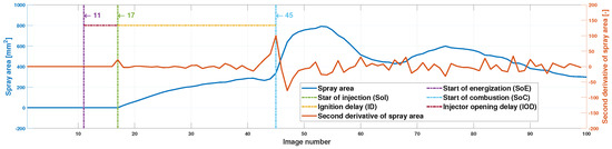 The injector opening delay IOD, in ms, and the ignition delay ID, in ms, are obtained with the spray area curve. To determine these two parameters, it is necessary to know in which image number the start of energization (SoE), the start of injection (SoI) and the start of combustion (SoC) occur. The start of the injection is obtained by determining the first rising flank of the spray area curve, and the start of combustion is determined by finding the maximum value of the second derivative of the spray area curve. This value coincides with a sudden change in the slope of the curve (see Figure 11). The beginning of the energization is known, and the camera software is configured to take 10 photos before this energization. Once these three values are obtained, the injector opening delay and the ignition delay can be obtained through